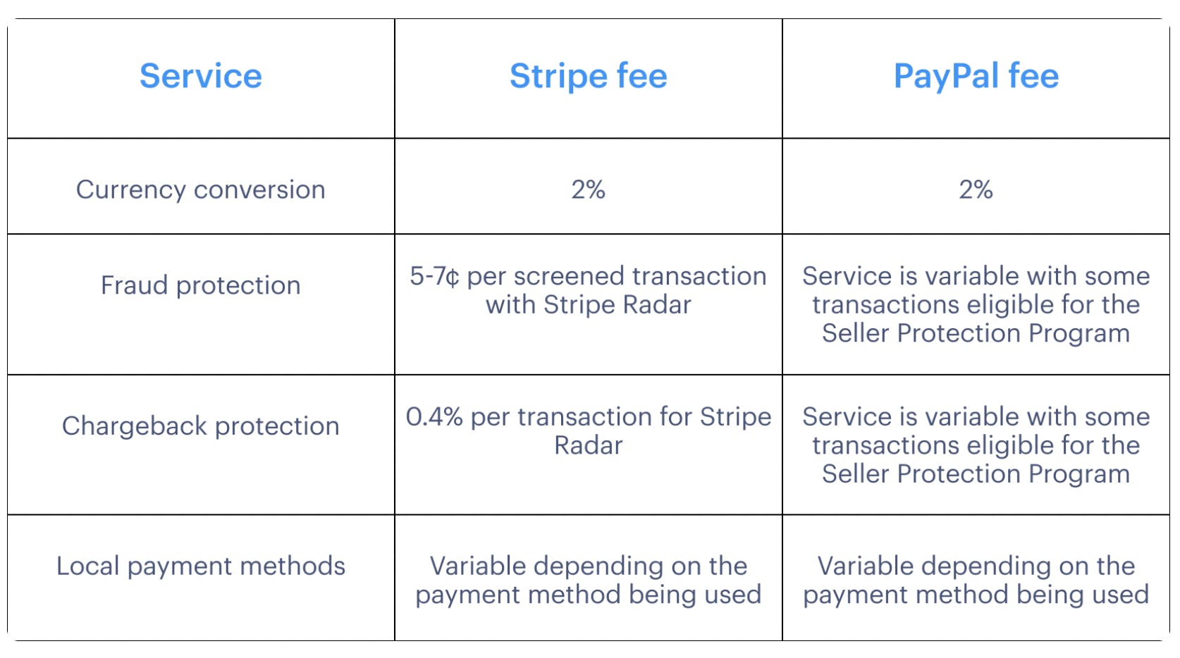 Cheaper international transaction fees | Stripe's currency conversion fees are lower (1%), whilst PayPal charges between 3-4% per conversion |