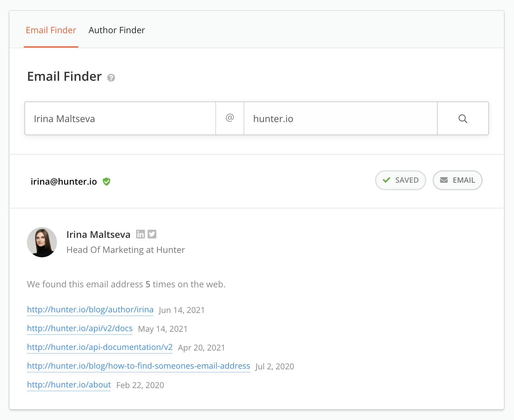 For instance, Hunter's Email Finder quickly pulls up the most relevant email addresses based on the person and domain names within seconds.