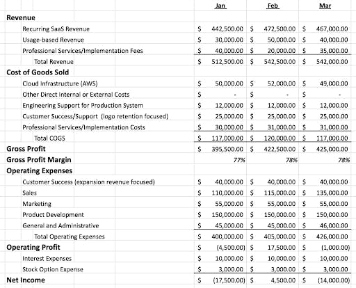 Well, good news – there’s a standard P&L format that investors are used to seeing. It's best to stick with the standard, so investors don't have to put in any extra mental effort to understand your numbers. Using the standard format also helps investors to easily benchmark you against other SaaS businesses.