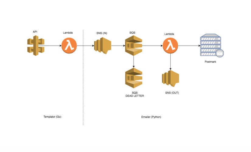 We send out thousands of emails a day and we already use SQS as a queuing service to make sure we can scale to higher load periods. This made it simple for us to attach a new split-out email sending Lambda written in Python to it, which abstracts away the email sending service (in our case, Postmark) in case we want to make changes in the future.