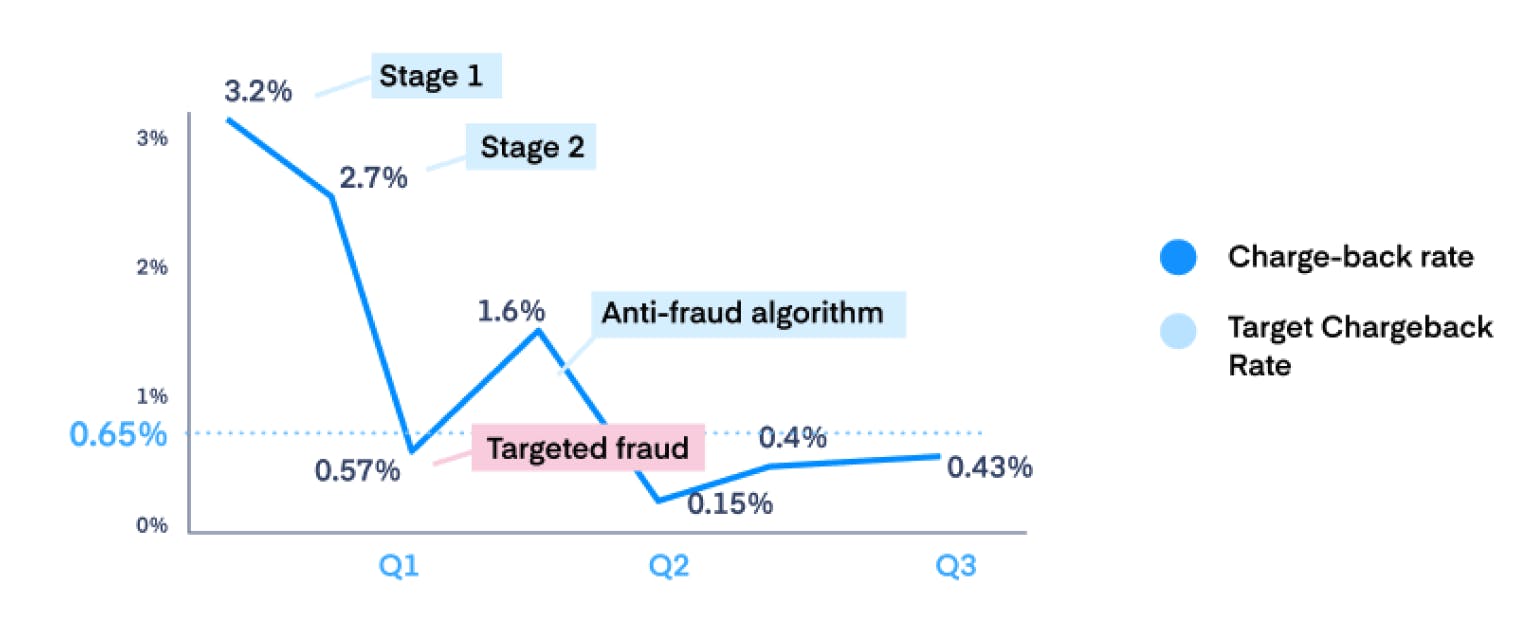 Before Paddle onboarded, chargebacks made up 3.2% of all orders. Over the next three quarters that was brought down to 0.43%, comfortably below the target rate of 0.65%. As of today, the chargeback rate is 0.34%.