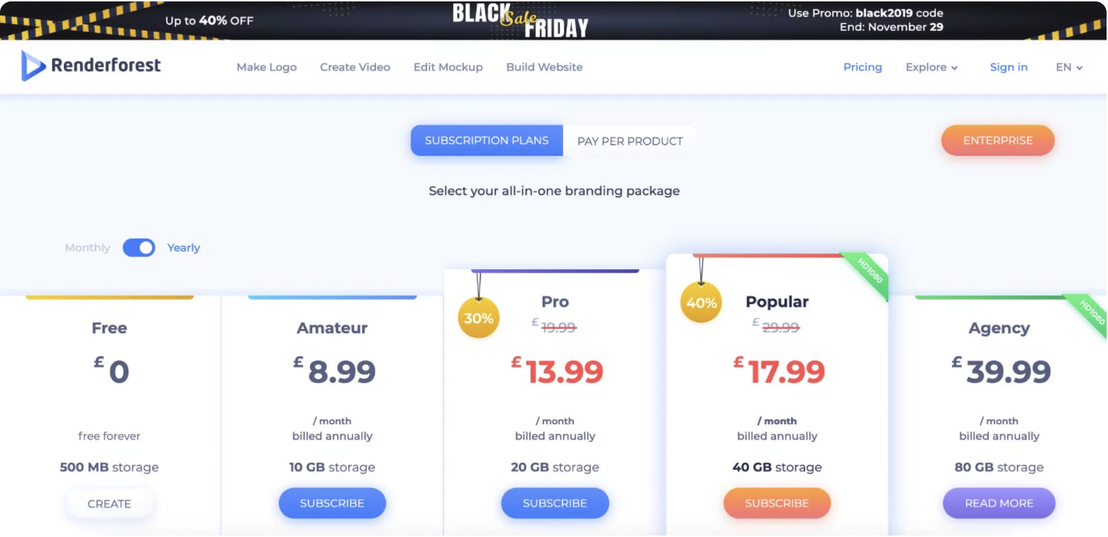 The flagship discount: Discount only your best-selling products, as seen with Renderforest’s Black Friday pricing below.