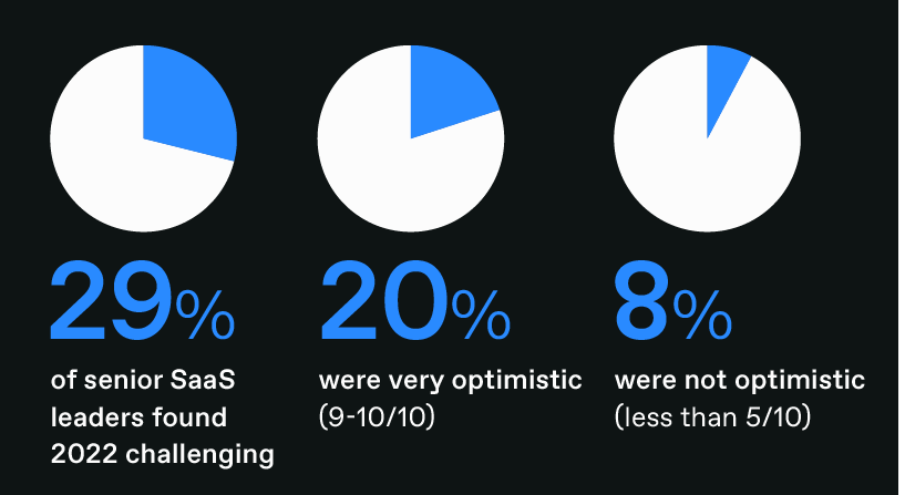To cut through the noise and get a clear picture of the SaaS landscape, we asked 100 SaaS Founders, CEOs, CFOs, and Finance Leaders what’s been happening in practice. Almost a third (29%) of senior SaaS leaders found 2022 challenging, but the survey also found that average optimism for the year ahead was over 7/10 (7.08). In fact, one fifth of senior leaders were very confident (9-10/10) and only 8% were not confident (less than 5/10).