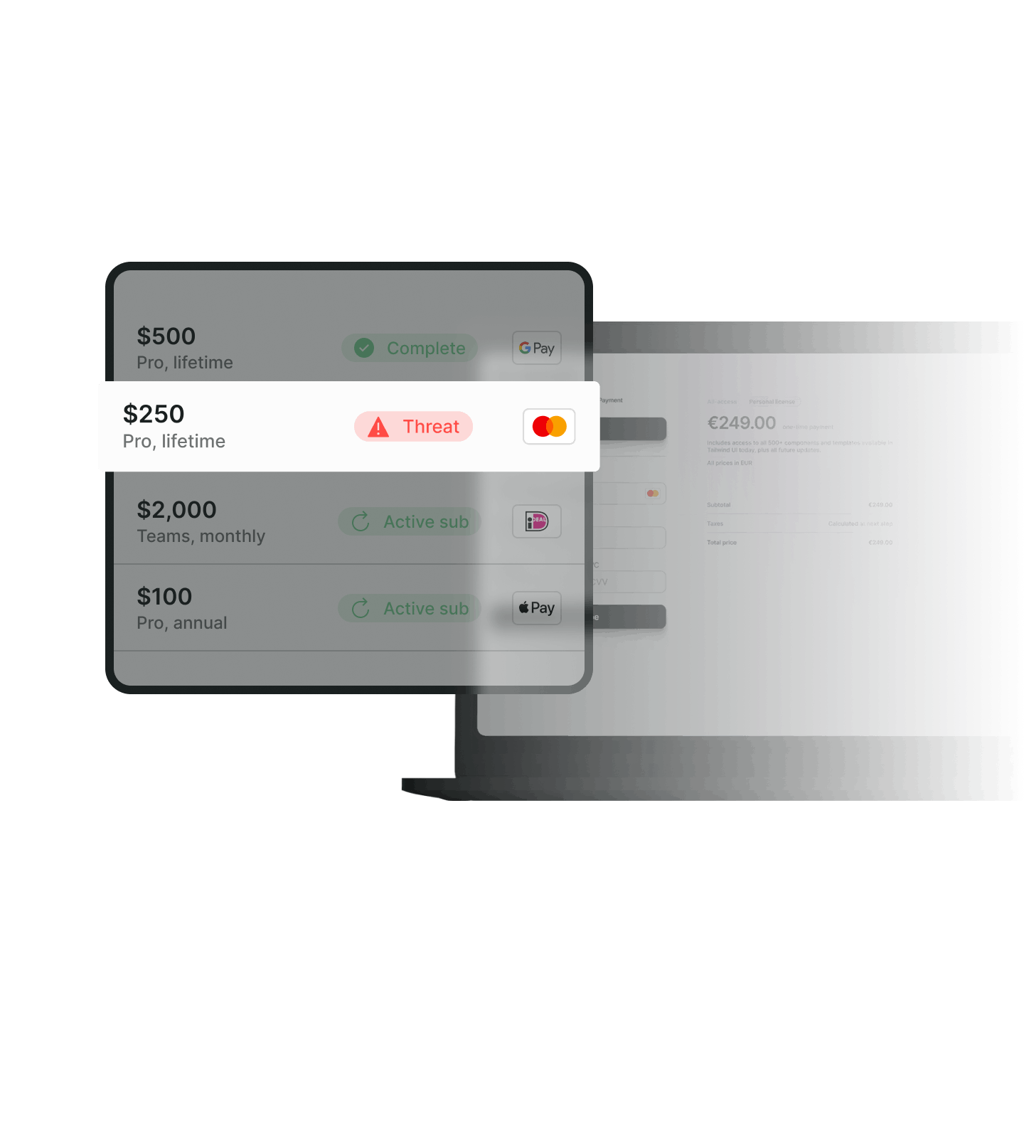 Paddle’s team continually reviews and optimizes the logic of our fraud protection to prevent the blocking of legitimate transactions or ‘false positives’ from reaching your account. We’ve built the team and the tools, so you can focus on selling, allow Paddle to handle your fraud management.