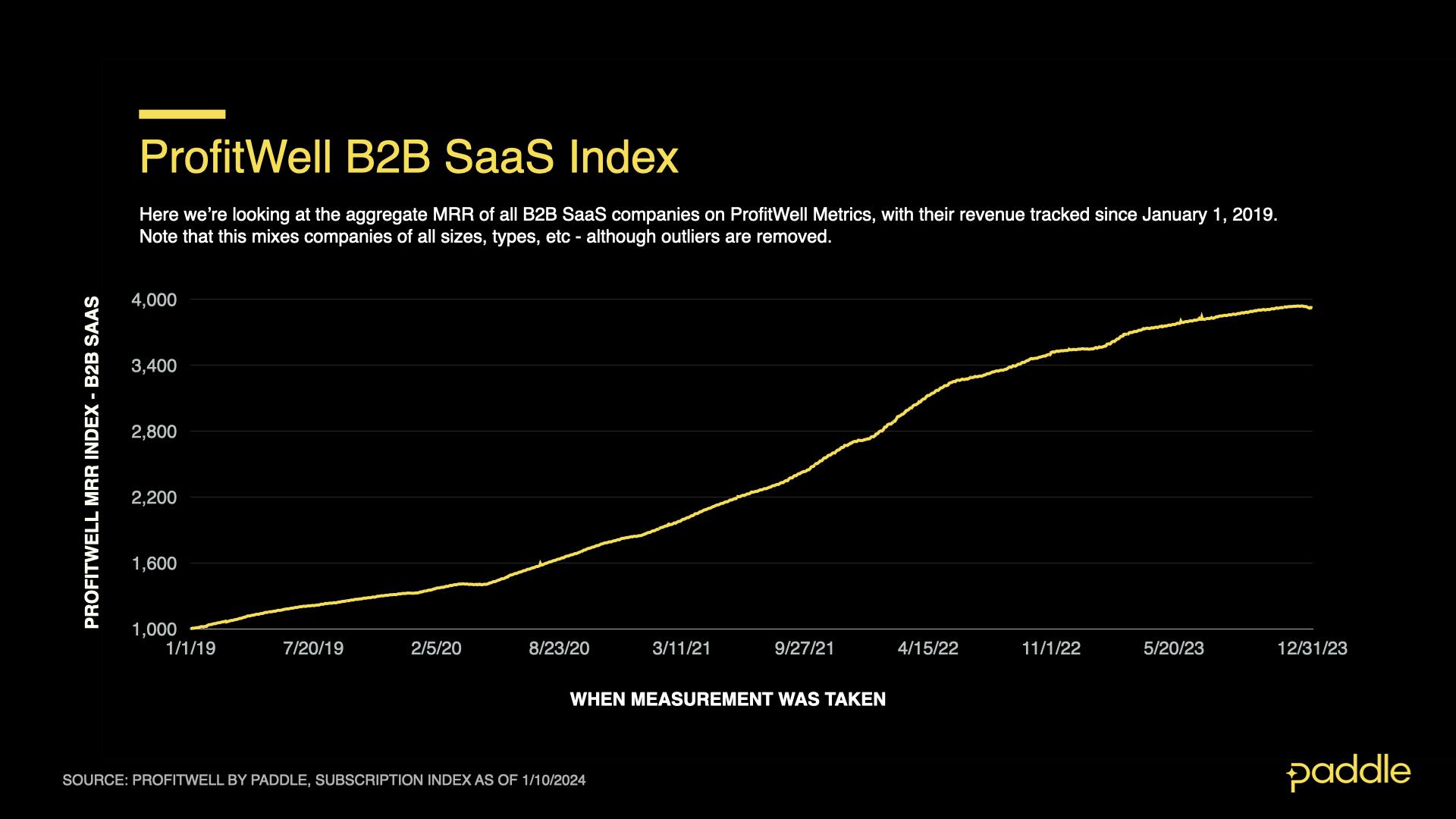 The ProfitWell B2B SaaS Index tracks the cumulative monthly recurring revenue (MRR) from a sample of the 34,000+ companies on ProfitWell Metrics. By measuring the revenue performance of this cross-section of companies over time, we can objectively observe how quickly the sector is growing (or not). The index does not adjust for inflation.