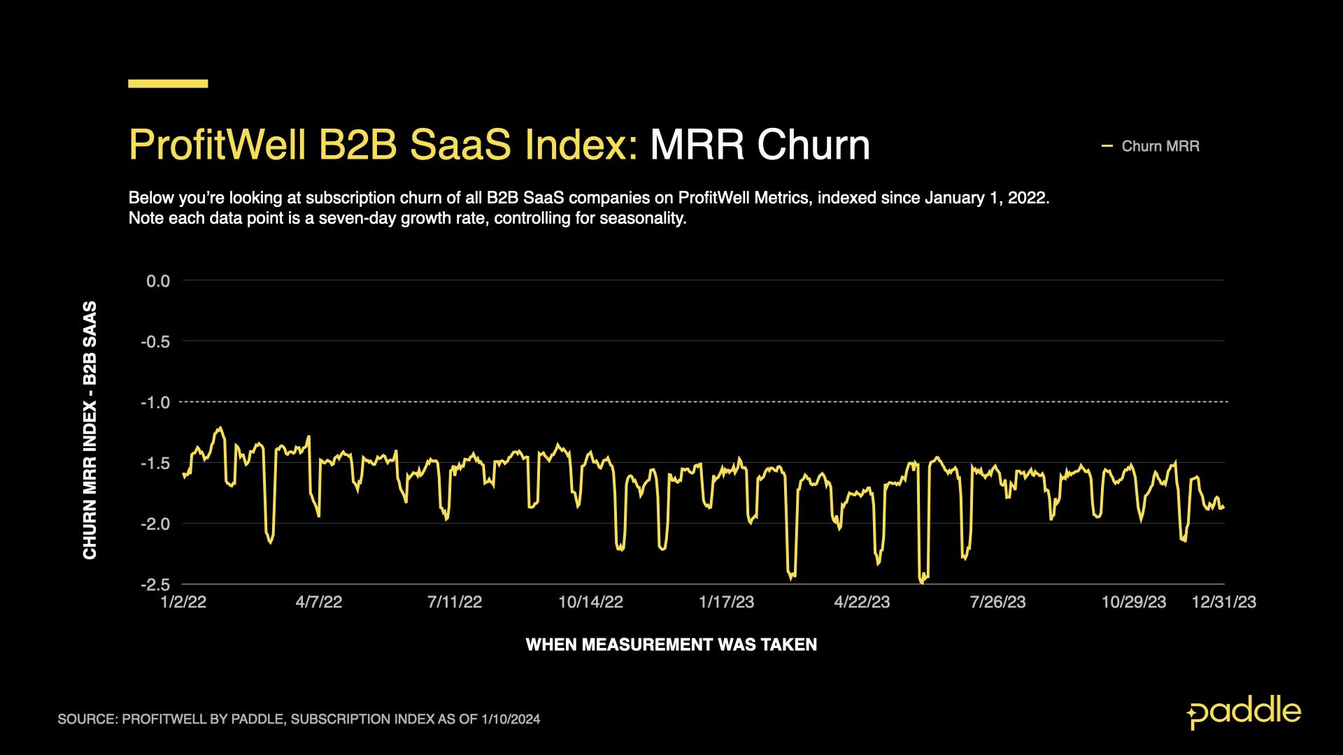 December’s MRR churn ended at an average of -1.85 making it the highest month for churn on record. This figure was also a 7% increase in churn from December 2022 and a 25% increase against December 2021 figures.
