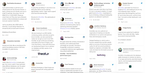 In building a longstanding customer base, you also develop a set of willing brand advocates. As a result, EverSQL has a whole page dedicated to customer testimonials.