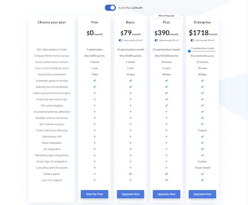 EverSQL operates with a product-led growth (PLG) motion. The product is sold under four packages that range from free through to enterprise, all of which are accessed through a self-serve checkout process.