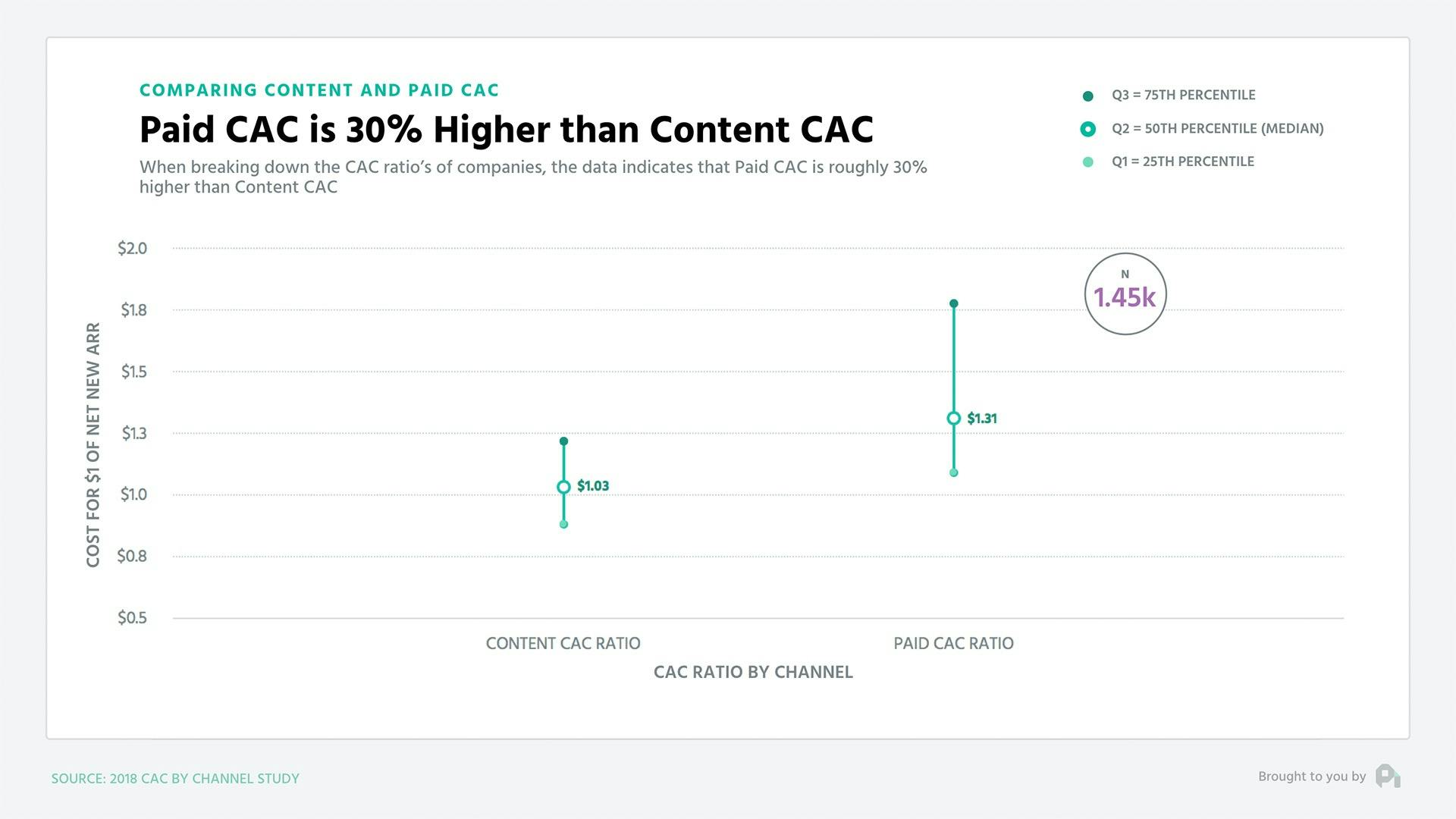 Customer acquisition costs (CAC) are up across the board, but content CAC is roughly 15% less than paid CAC, suggesting some efficiency when it comes to an inbound marketing strategy.