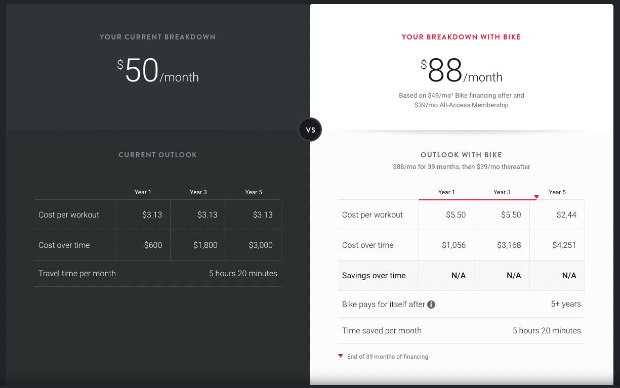For the customers that aren’t completely sure if buying the Peloton bike or treadmill is for them, Peloton created a comparison calculator to incentivize customers to move from their current exercise regime to a new one.