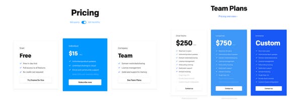As an interactive design and prototyping tool, they’ll be getting the attention of individuals (both B2C and B2B) and teams or businesses. Additionally, they segmented prospective, individual, and teams into their pricing plan.