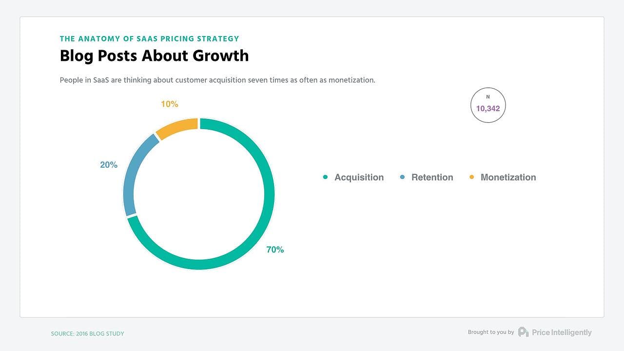 Growth is more revenue, not more customers.How you monetize those customers is vital. Yet, out of every 10 blog posts on growth, 7 are focused on acquisition, 2 are centered around retention, and only 1 is about pricing.