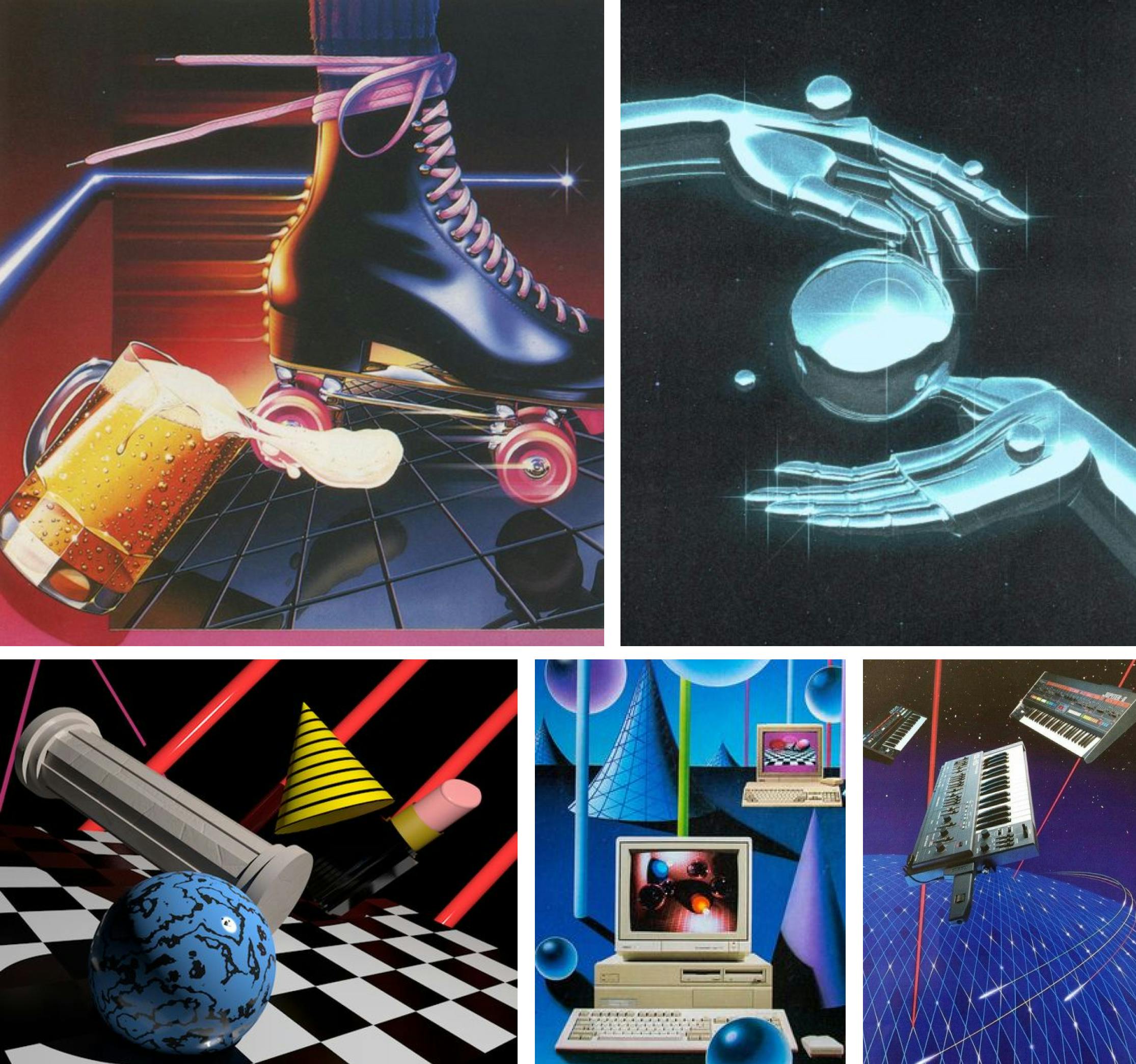 Sci-fi also very much captured the zeitgeist of the time, with the likes of Blade Runner, Star Wars, and Tron sweeping through Hollywood- permeating into all walks of life including art and design. This gave the airbrush, 3D photo-realistic style very futuristic motifs, from shiny chrome materials to robot hands, to heavy use of perspective Tron-like grids, creating boundless landscapes that felt perpetual and grandiose.