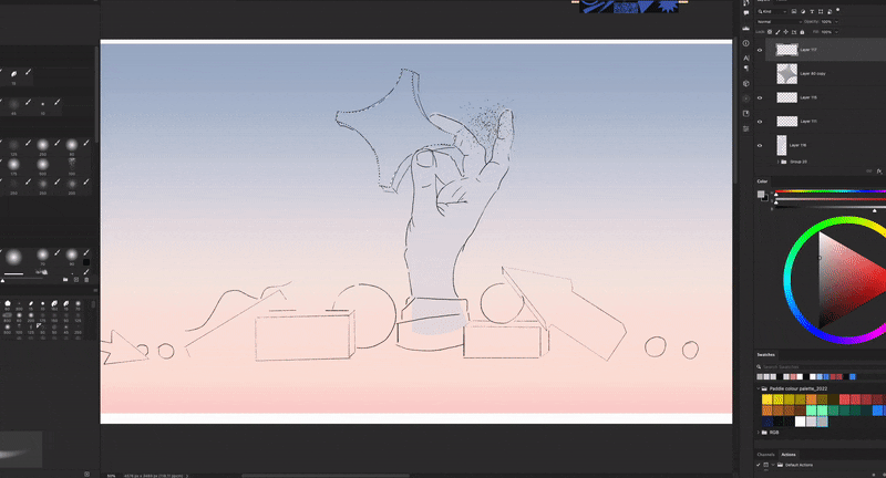 Following the research I began painting the illustrations in Photoshop, utilising various bristle and texture brushes to give the work a hand-painted and therefore human-centric feel.