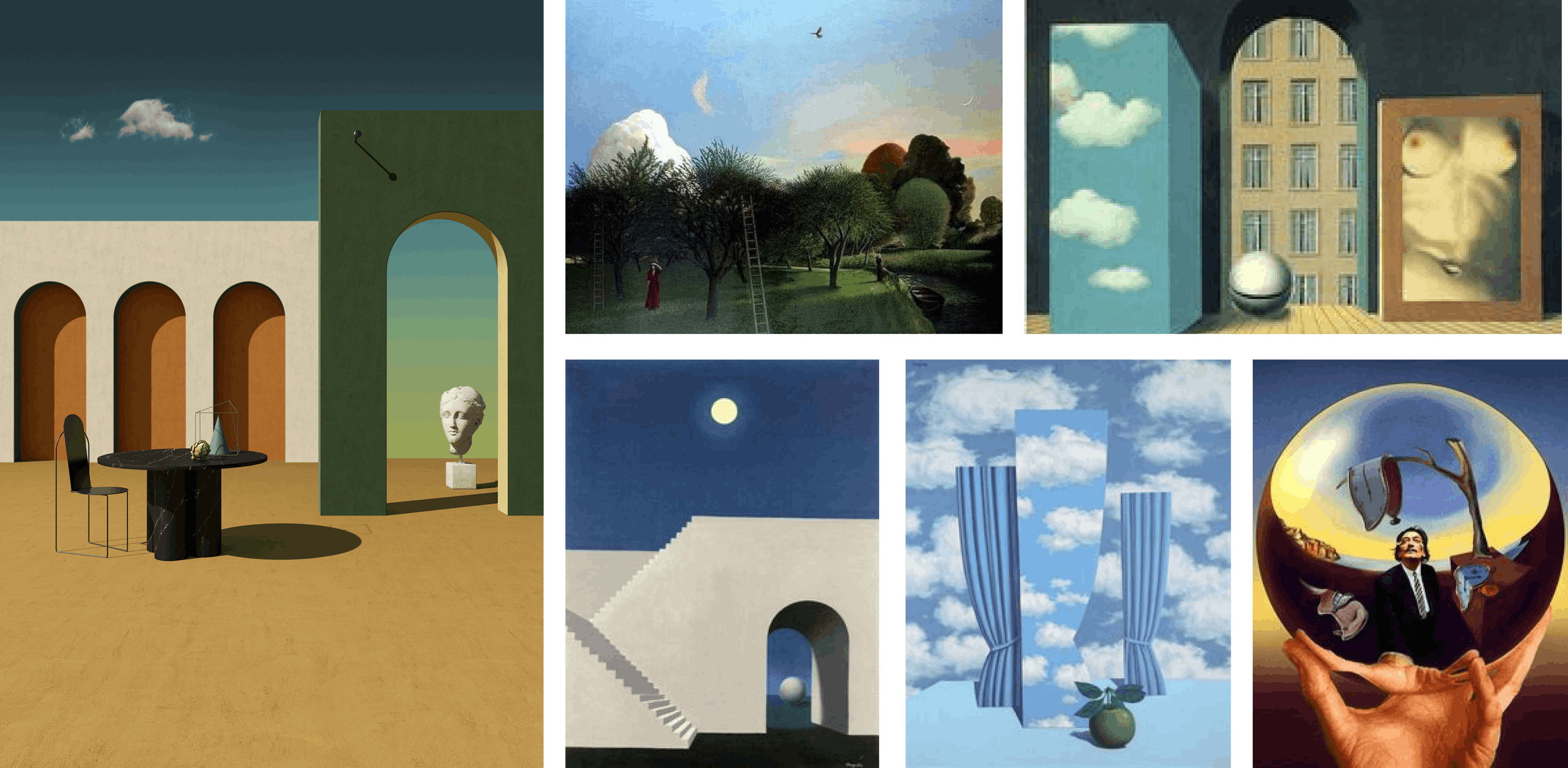 I was also heavily inspired by alot of artists of the Surrealist movement in the early 19th century including Rene Magritte, Giorgio De Chirico, Salvador Dali and David Inshaw. Alot of these works exist on these 3D planes giving that feeling of perpetuity we were looking for, as well having dramatic, emotional lighting spilling across the respective compositions adding drama and interest. Magrittes convention bending is inherently intriguing to the human eye, whilst David Inshaw works contains elements of whats called 'magic realism', fantasy worlds that are grounded in realism enough to really allow you to empathise and get lost in this impressionist reverie, also aligning itself well with the other-worldly sci-fi aesthetic in the research before. These elements played in very nicely to the idea of creating worlds where are sellers are yet to venture into and instilling a feeling of inspiration and excitement.