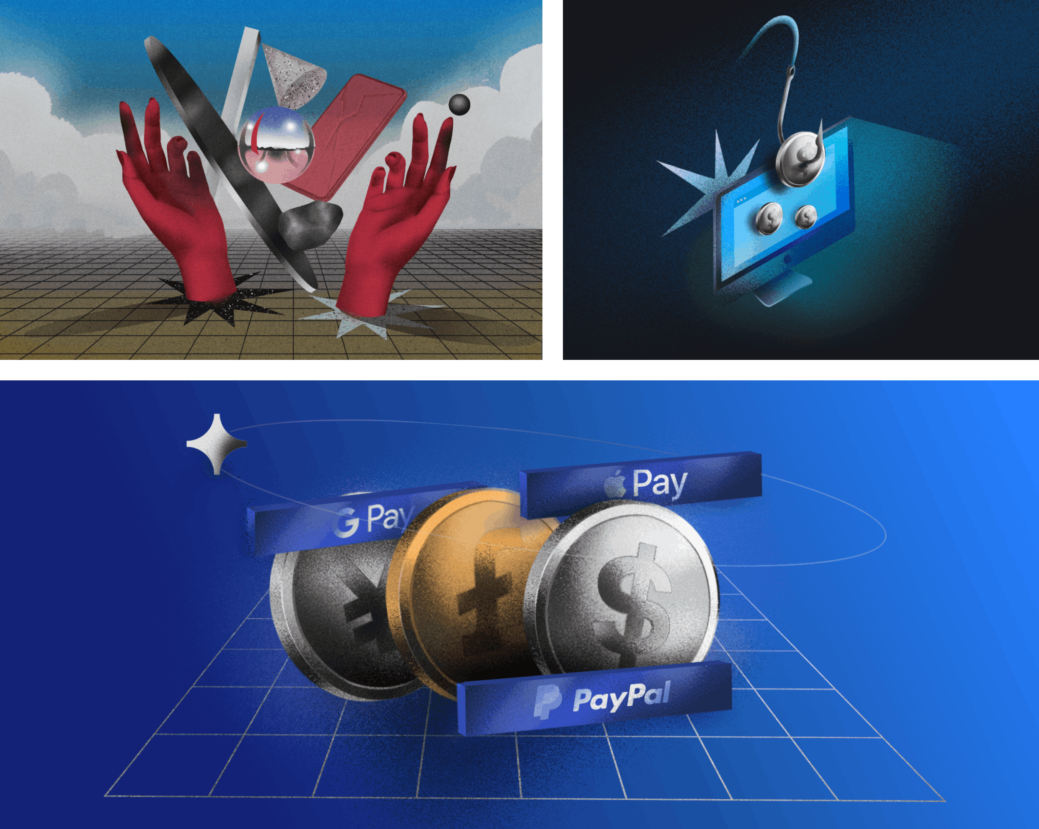 We decided to focus on two types of illustration approach; a more tangible, purpose driven style that represented the features, and then a more grandiose, abstract design to represent the awe-inspiring emotional core of scaling your business to unchartered territories, all whilst having the Paddle 'North Star' as the main brand motif to lead the way of SaaS success . The first designs took inspiration from the research of 80s perspective grids, combined with elements of early 19th century surrealism such as Dali and Bosch. Throughout the style I applied a chrome, metallic treatment on elements in the compositions to give a shiny, premium quality effect, as well as allowing us to utilise lighting on the 3D plane to highlight certain elements.