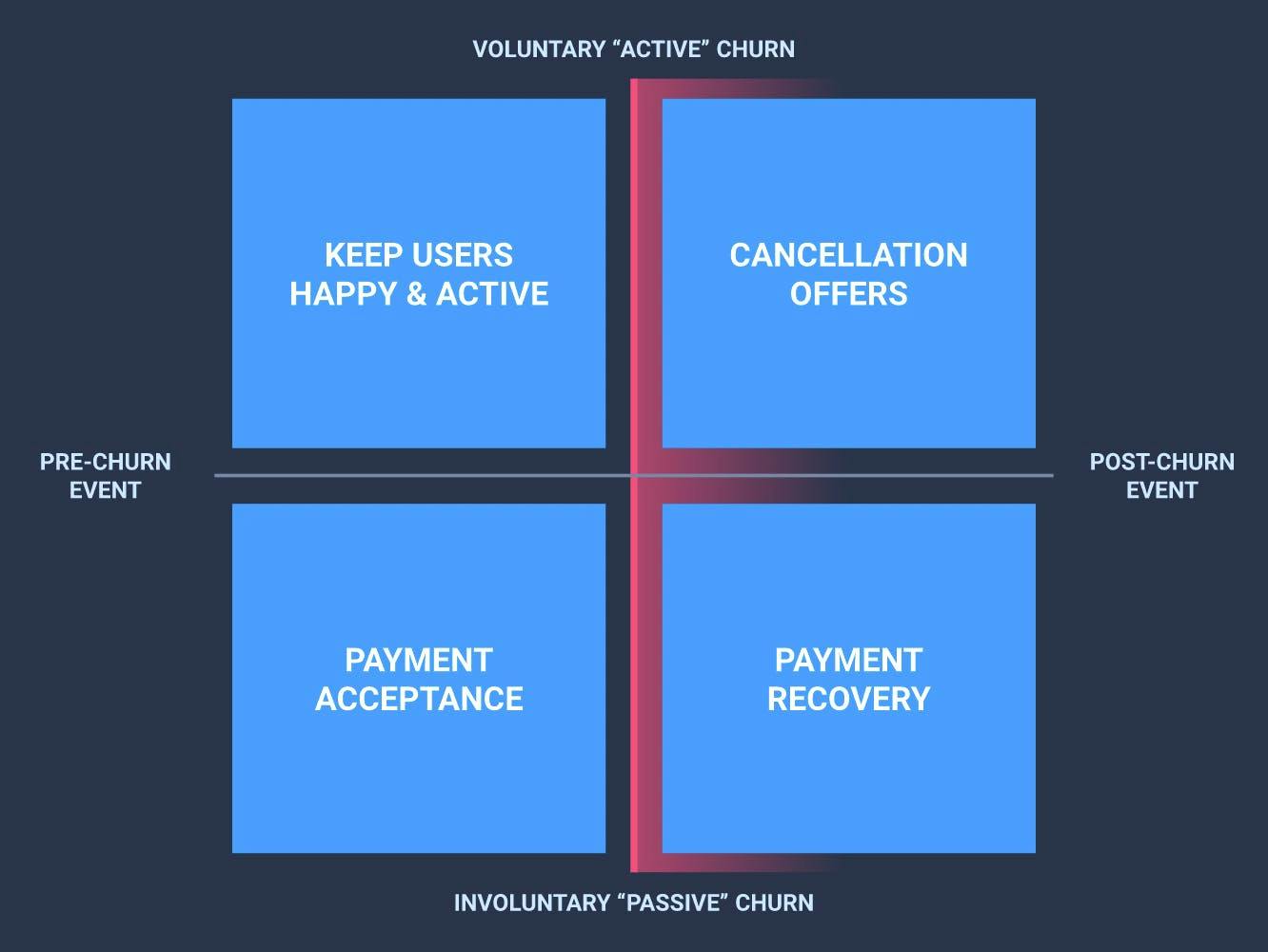 You should build your churn reduction strategy across all four quadrants — pre & post-churn for voluntary and involuntary churn.