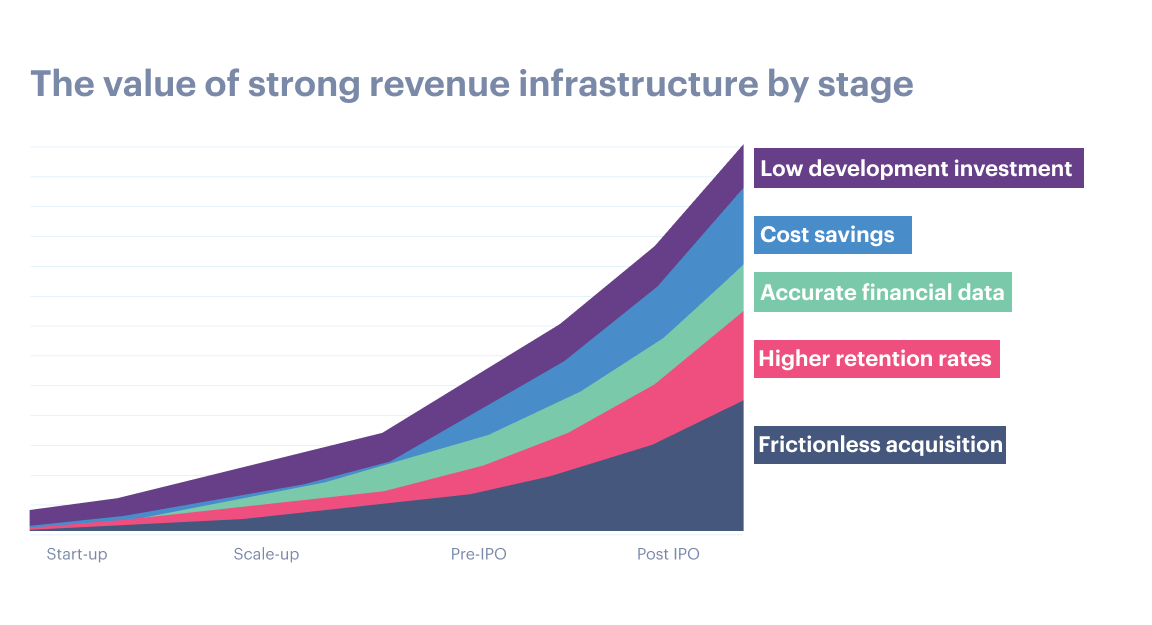A streamlined and integrated revenue infrastructure improves a SaaS business's performance and valuation at each stage of development. As SaaS businesses scale, robust revenue systems deliver different benefits at different stages, with the early-stage benefits carrying through to post IPO/exit. It's always beneficial, for example, to reduce buying friction and improve NRR.