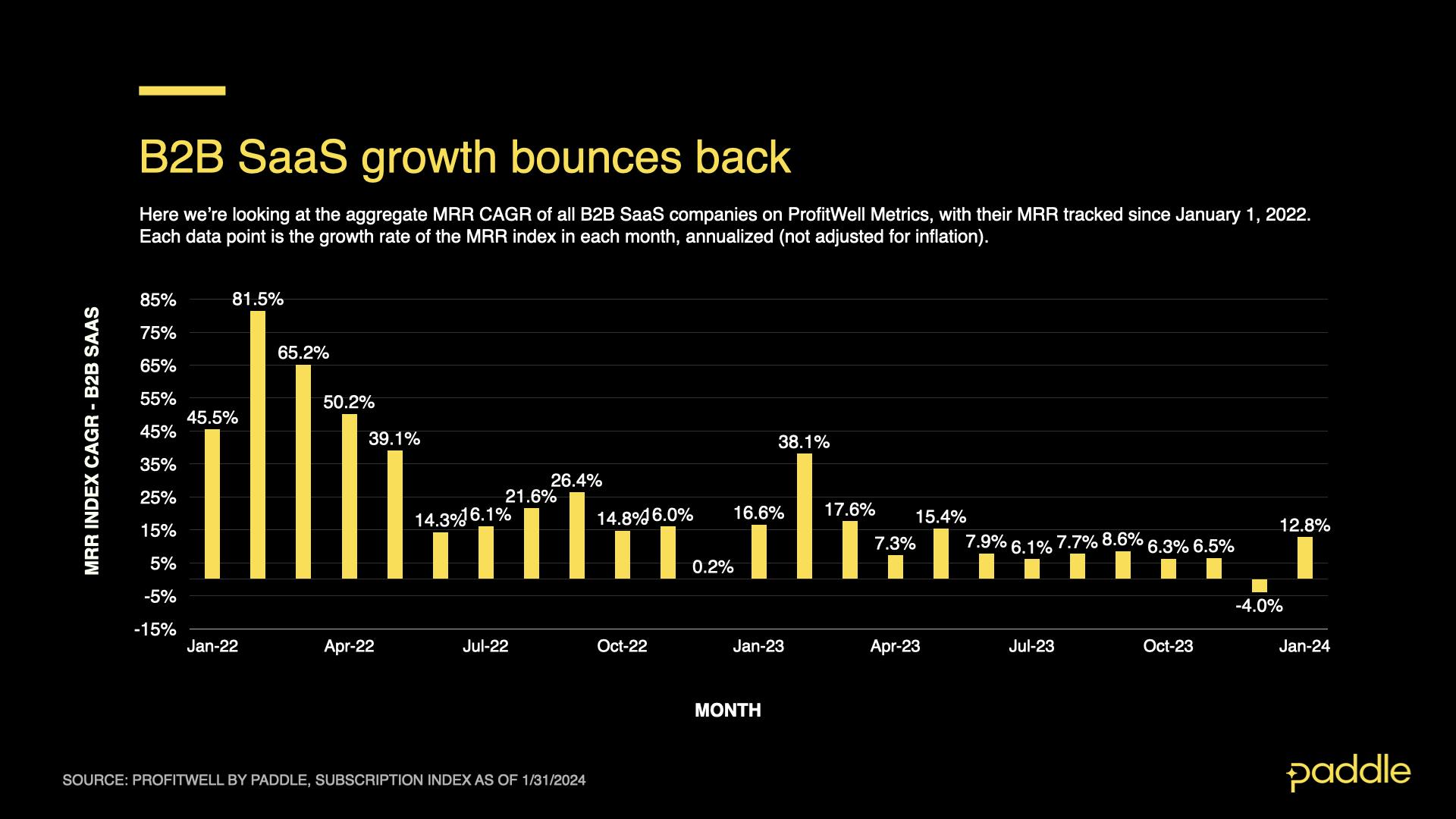 Following its first-ever decline in the MRR compound annual growth rate (CAGR) in December, the ProfitWell B2B SaaS Index bounced back in January, growing 12.8%.