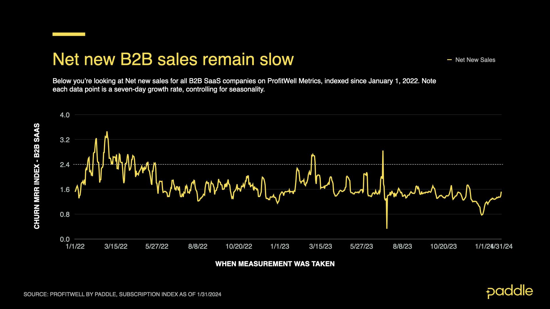 The ProfitWell B2B SaaS Sales Index ended January at an average of 1.26, a small 3% lift from December’s three-year low. Compared to January 2023, however, new sales were down 18%.
