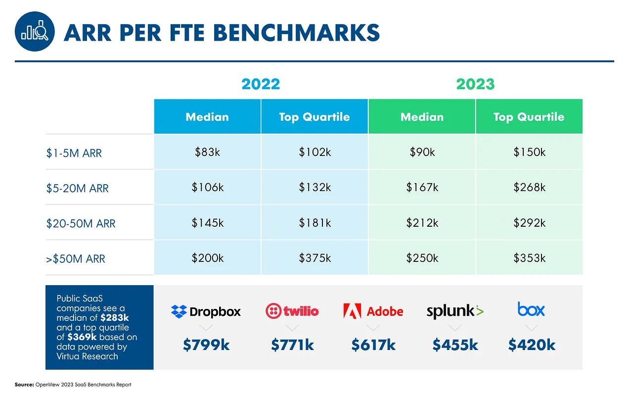 In a report we published with OpenView last year, we found that companies were paying more attention to productivity, focusing on the new north star metric: ARR per FTE (annual recurring revenue per full-time employee).
