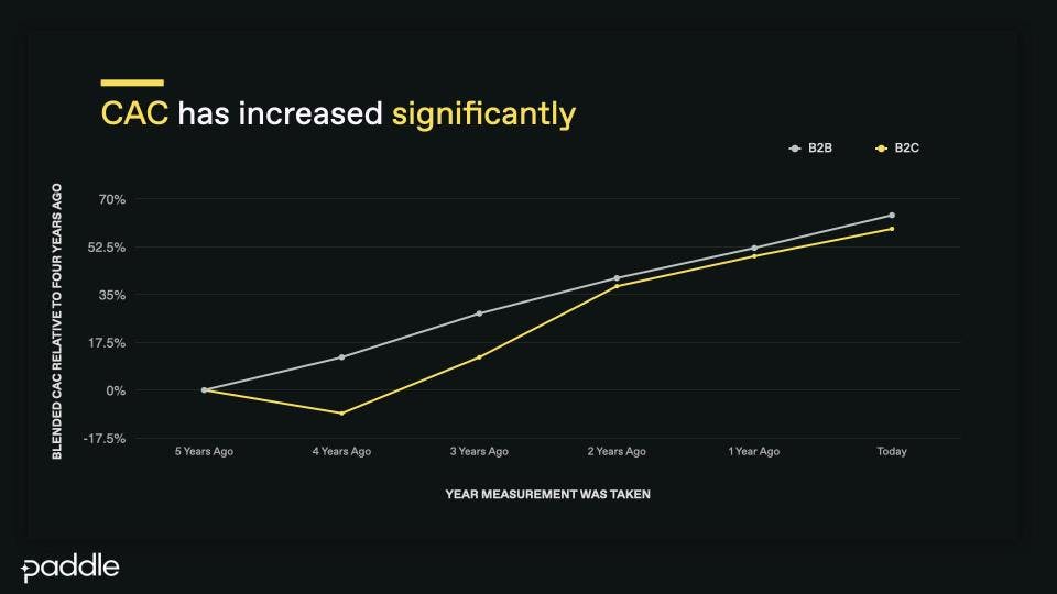 Regions like the US, UK, and Northern Europe are increasingly competitive, with every company having to fight more for the same target customers. This has manifested in the data as escalating customer acquisition cost (CAC).