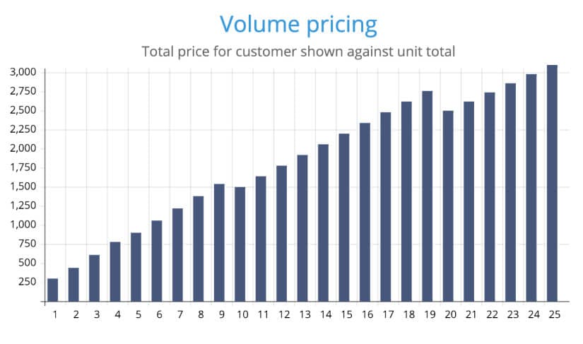 With volume pricing, the amount of discount is still determined by the number of units purchased by the customer. However, the discount is applied to all units. The greater the demand for your product or service, the greater the discount on every unit within the set price ranges.