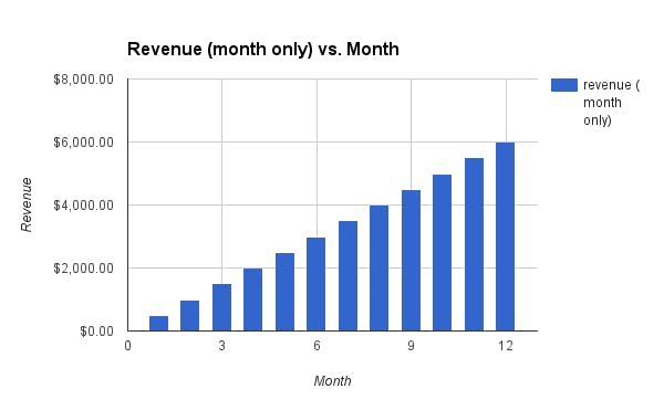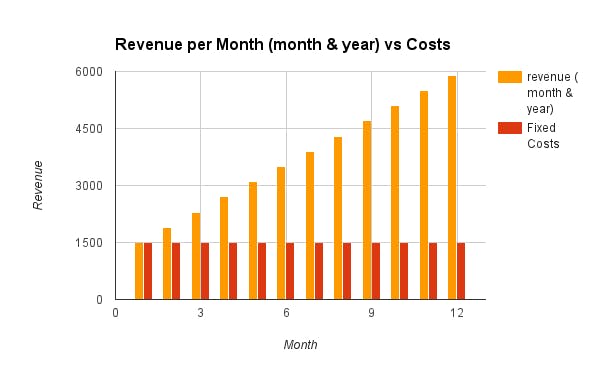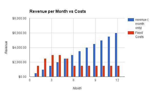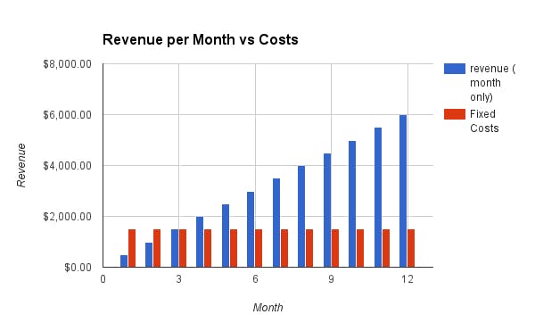 But something is missing from that graph — costs. For simplicity, let’s say the company only has fixed costs of $1500 a month: