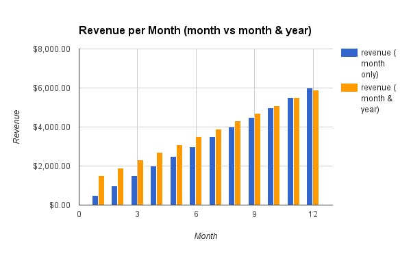 This is with just 10% of customers switching to an annual plan, and with a 1-month discount. When you look at monthly-only subscriptions vs. month and year, you can see that you are trading off slightly less revenue overall for more revenue up-front: