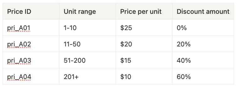 If a customer selects 55 units, you’d pass through price ID pri_A03 and we would charge the customer $825, a 40% discount. By using prices to achieve volume-based discounts, you leave room to offer an additional discount in the future, whether as a thank you or as a retention tactic.
