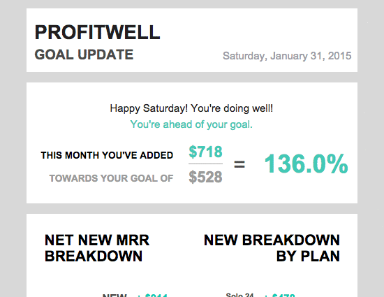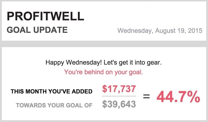 Data supports this notion, as well. In a recent study we conducted amongst SaaS companies, we found that those companies sharing their financial progress with their team were growing 34% quicker than those who didn't. Teams appreciate this information, as well. We see 60%+ open rates on our goal progress notifications in ProfitWell, indicating that teams want to be engaged and focused on these metrics.