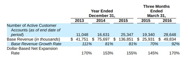 In their S-1, Twilio reported their Dollar-Based Net Expansion Rate (change in revenue, for a specific customer cohort, from one year to another) to be 170%, 153% and 155% for the years 2013, 2014, and 2015 respectively.