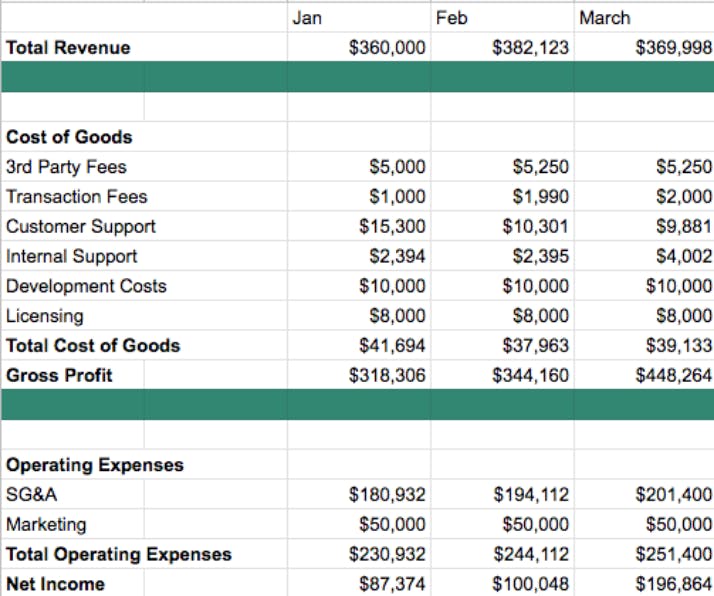 This is what the financial reporting for a SaaS company in good health might look like. Their SG&A is under control (no need to break it out into individual expenses), vendor fees are constant, and the company has a good chance of seeing more improvement in its next month.