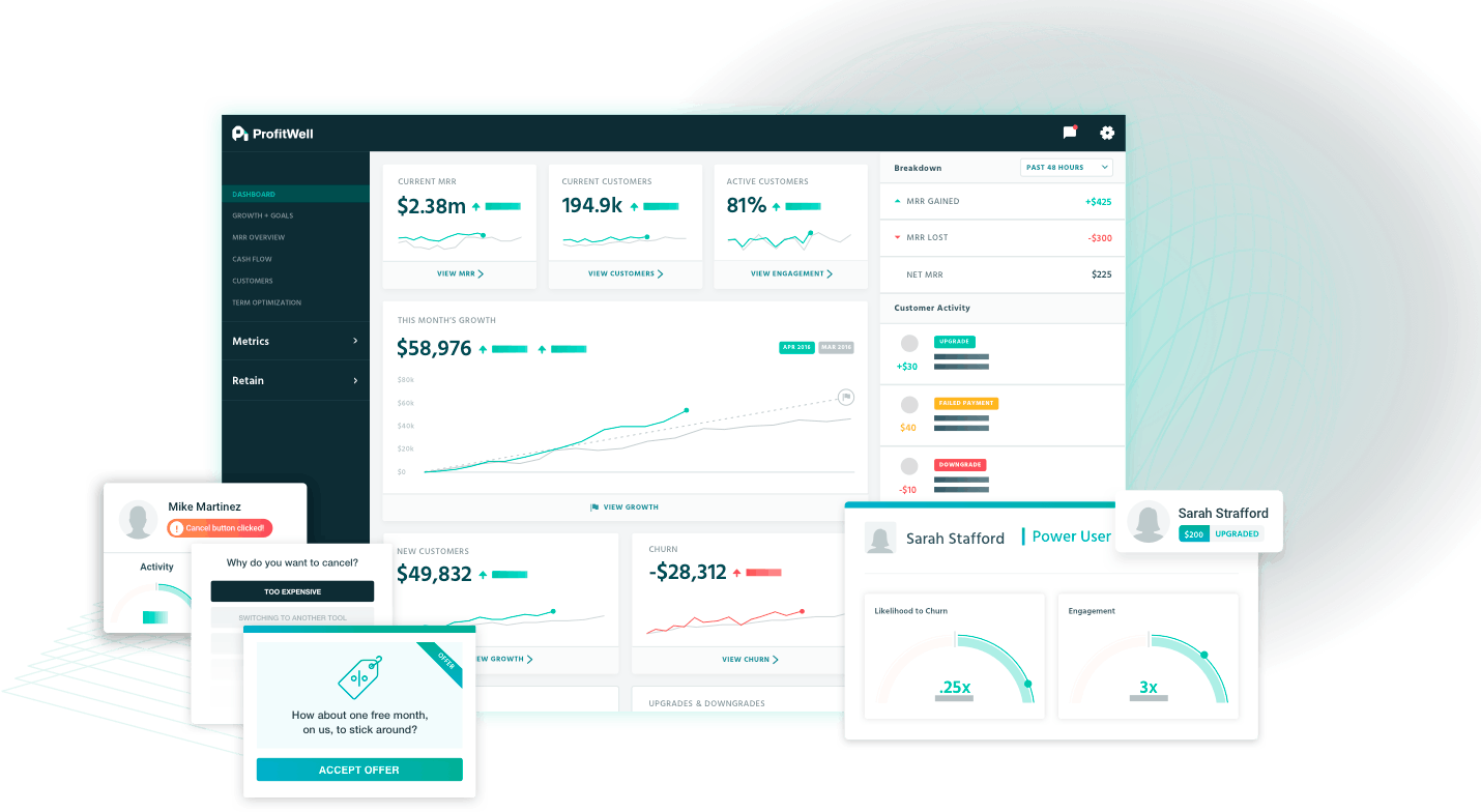 ProfitWell Metrics provides a fantastic overview of everything happening in your subscription business, from churn rates to delinquencies. ProfitWell Metrics has been trusted by more than 10,000 successful SaaS subscription companies.