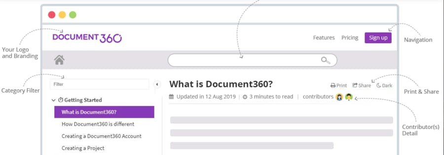 - Features - Document360 supports the creation of both public and private knowledge bases, so you can create one for your staff to use and a separate one for customers. Its advanced search feature will allow visitors on your site to see autocompletion suggestions as they type in the search bar.