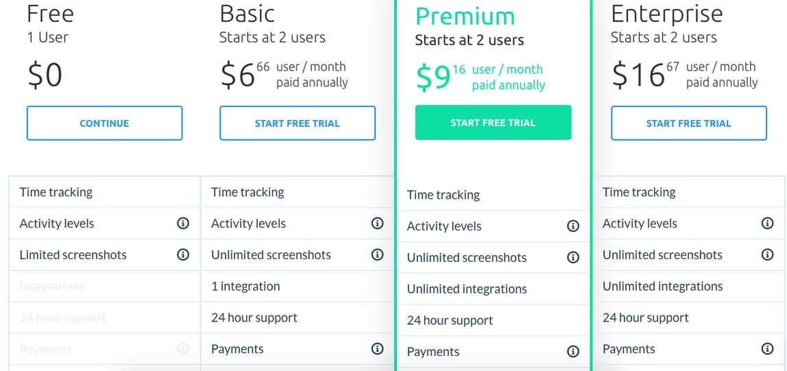 However, if you're any SaaS company worth your salt, you'll be offering more than a single pricing point for your product. You might have, for example, a few different buyer personas across a few different fields, like Hubstaff, which counts legal firms and construction companies among its customer base for its time-management software. Not all of these companies want the same set of products, and not all of them want to spend the same amount. So, Hubstaff offered this series of pricing options.