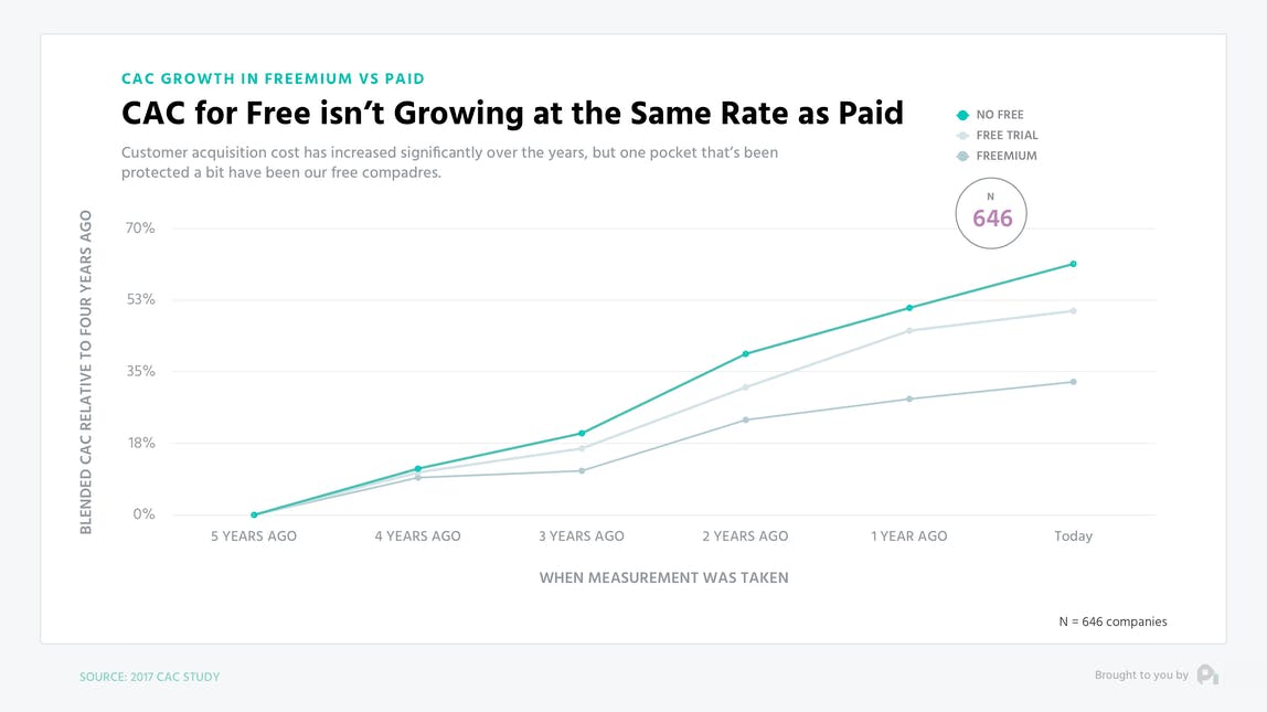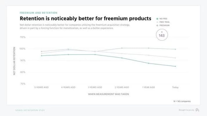 As we can see here, companies that offer only paid pricing or a free trial have seen their CAC rise exponentially since 2014. Those that converted to a freemium plan, on the other hand, have avoided such a steep rise. As the chart shows, these companies also have a nearly 20% better net retention on an absolute basis than their non-free counterparts.