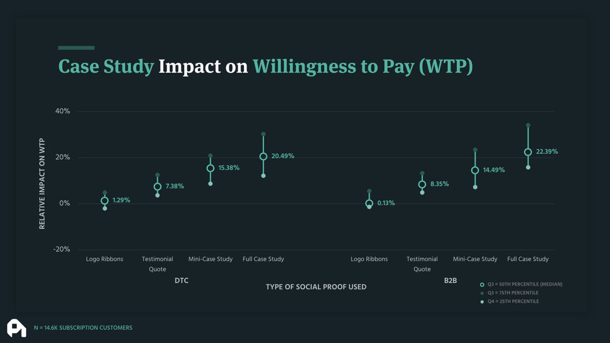 A mini case study, increased willingness to pay by about 15%, and then a full case study increase by 20 to 25%. So essentially, these types of case studies, again, we're kind of showing we're supporting data here that essentially, if you include these types of things, those viewers, especially those who are particularly influenced by this kind of social proof, are actually willing to pay more, which thereby will also affect your conversion rates as well.