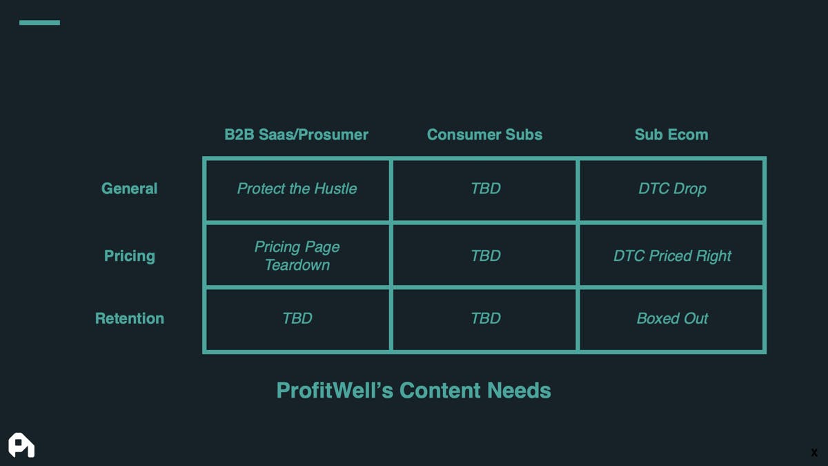 So this is what we set out to do right now. We've fulfilled, I think, half of the grid for the most part, more of the grid, depending on how you look at it. We've consumer subscriptions and B2B. We can kind of get away with combining some of that content. This piece of content you're listening to right now, this is part of the general bucket for B2B SAS.