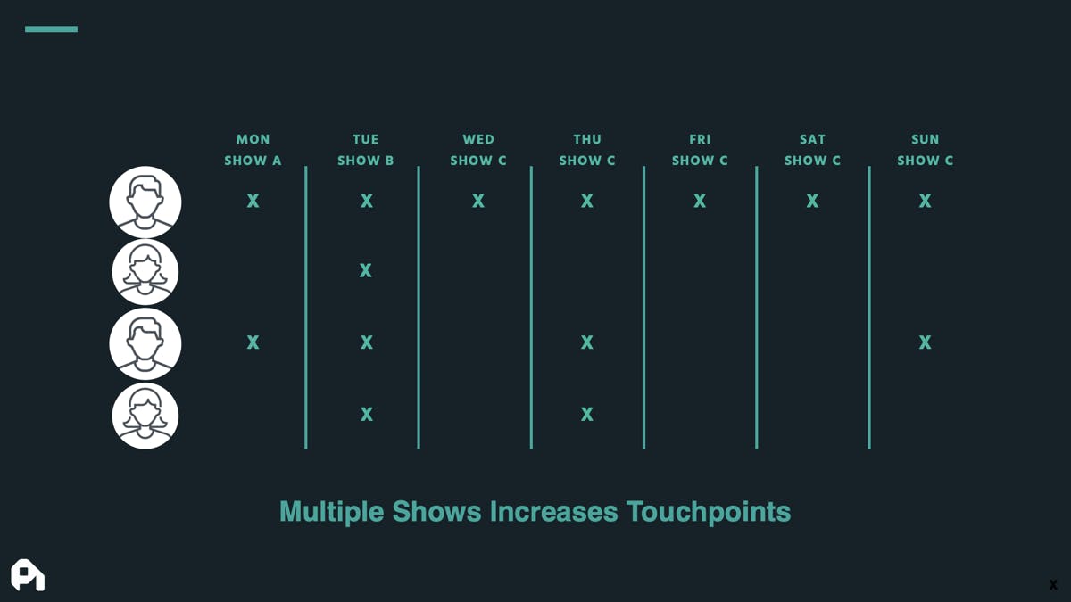 And then we kind of have this general bucket, which is basically folks just getting washed over with our brand, but also getting on metrics and some of our other products. And so the basic idea here is that we have this cross-section, right? So we have these three types of verticals, three types of content. We want a show or some sort of good content in every single one of those buckets.