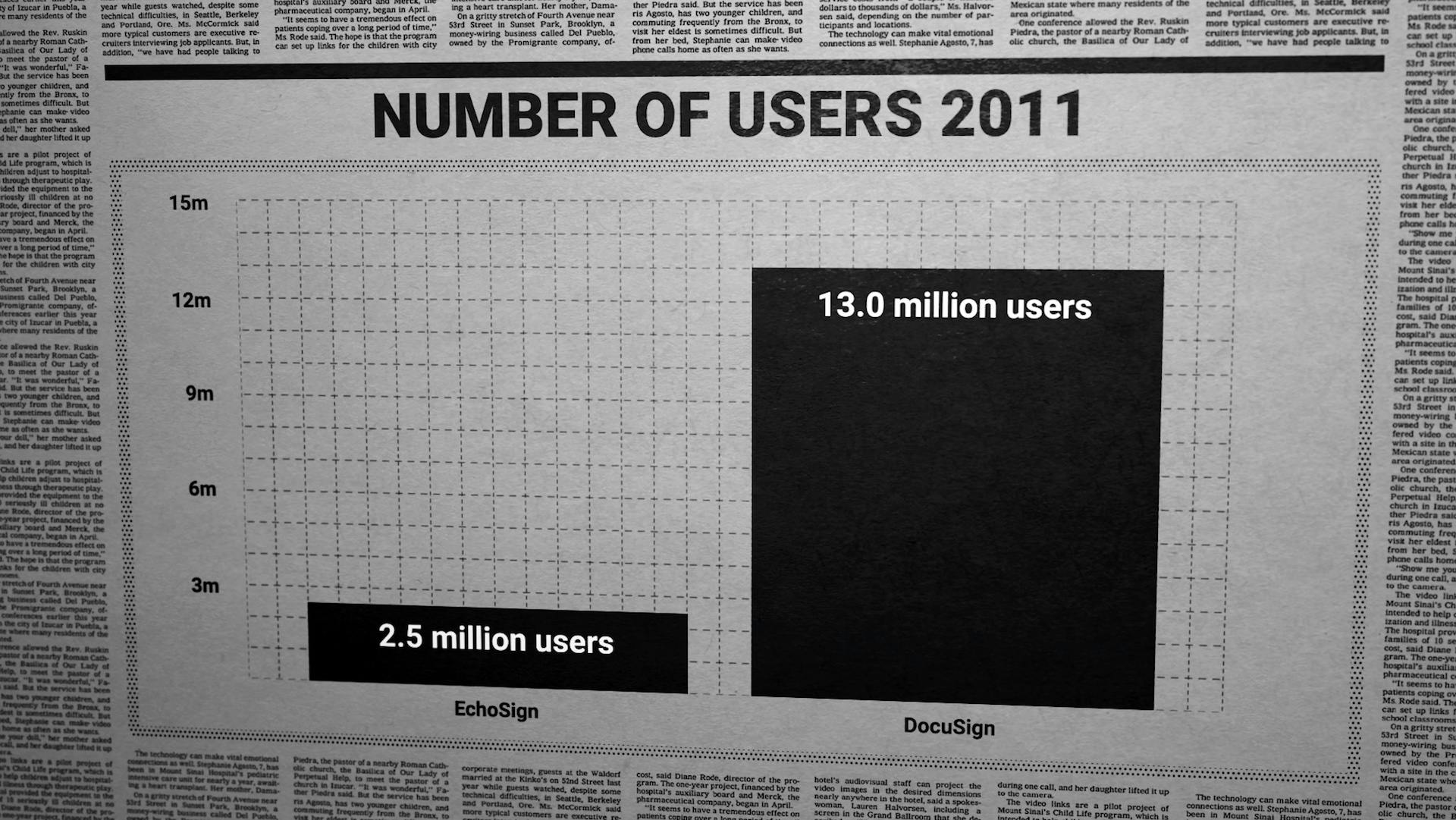 EchoSign started operations in late 2005. EchoSign, like DocuSign before it, benefited from streamlining legacy processes and reducing clutter. It even began with a freemium plan for folks who needed to manage 20 documents or less. This tactic helped boost EchoSign to more than 2.5 million users by 2011. Not too shabby. That is, until you look at DocuSign’s over 13 million users as a comparison. EchoSign needed a prayer if they wanted to compete.