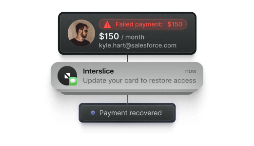 All payment recovery notifications can be sent via email, in-app or SMS. Set it up once and we’ll send out personalized, white-labeled messages to the right users.